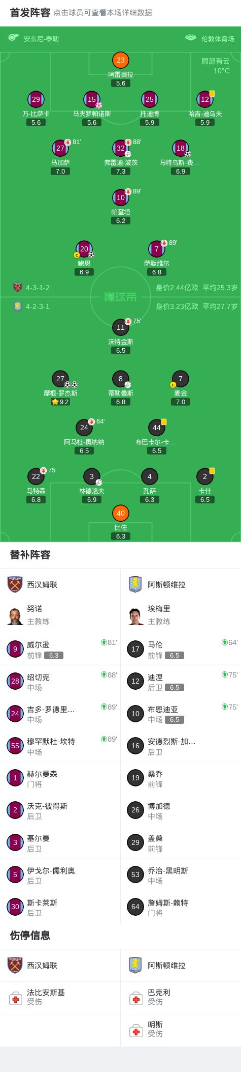北京时间12月14日英格兰足球顶级联赛 联赛 第16轮,西汉姆联主场对阵阿斯顿维拉。西汉姆联马特乌斯-费尔南德斯破门,鲍恩破门,马夫罗帕诺斯自摆乌龙。阿斯顿维拉摩根-罗杰斯梅开二度。最终比分西汉姆联 2-3 阿斯顿维拉。关键事件第1分钟,完美开局,费尔南德斯抢断成功小角度破门,西汉姆联1-0维拉